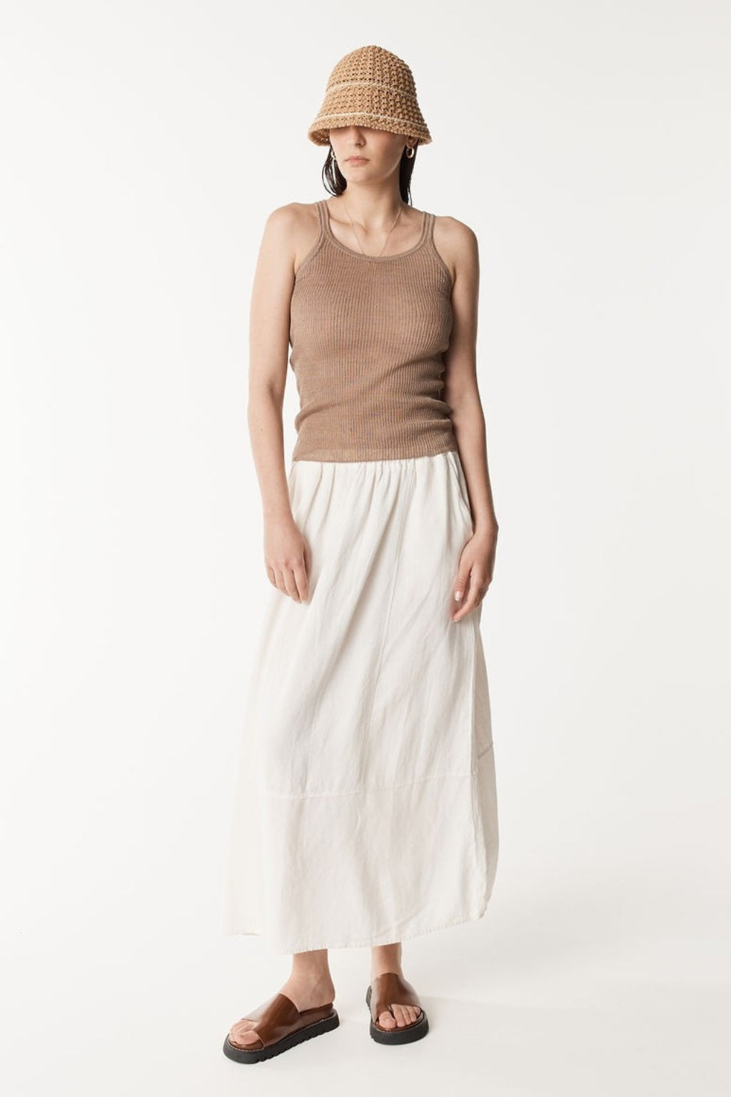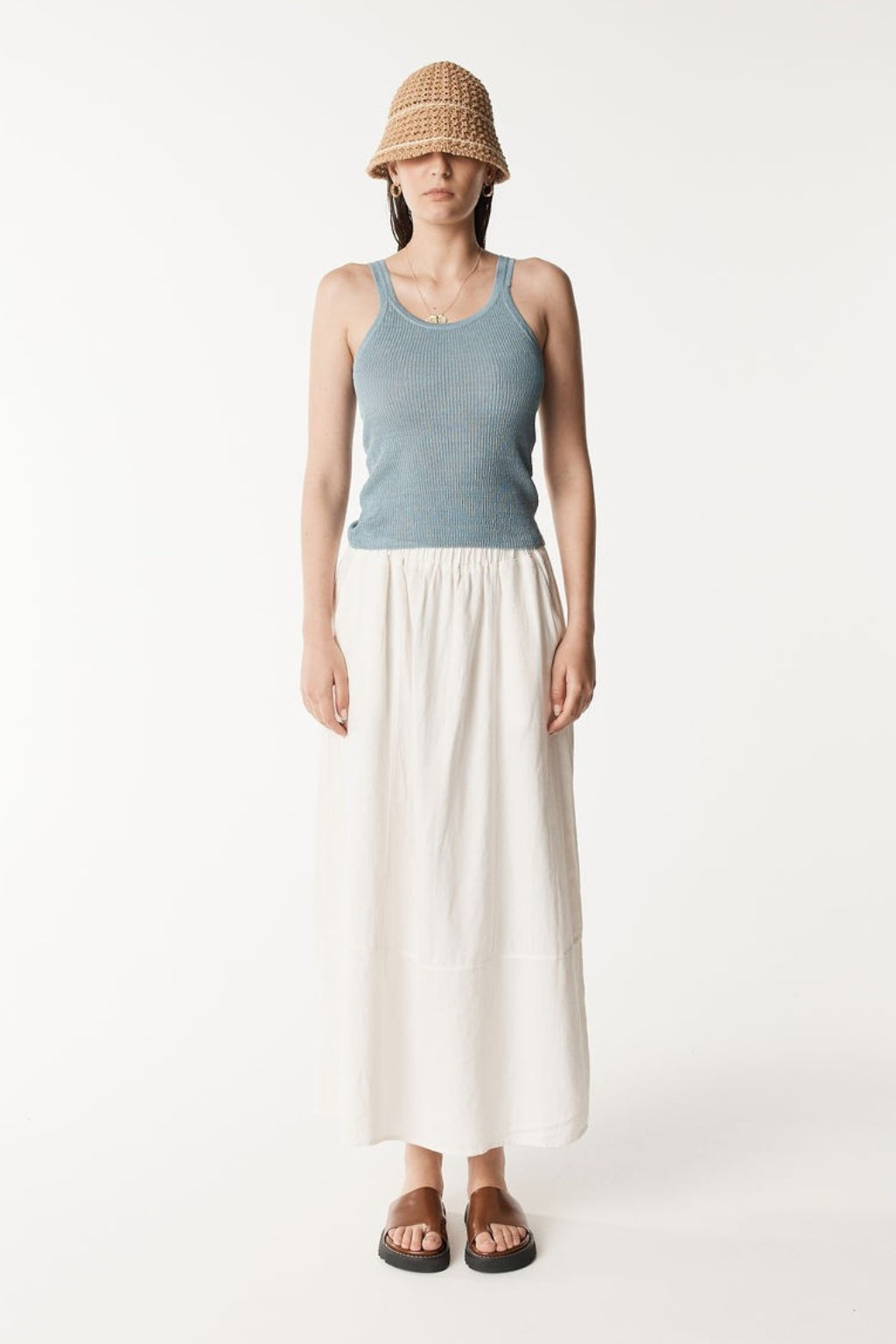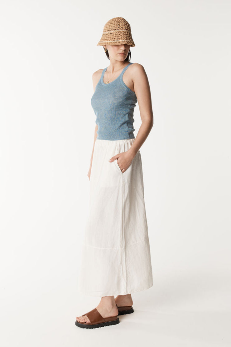 The Freya singlet, a sleek and flattering summer essential crafted from fine ribbed linen for a light, breathable texture. This slim-fitted singlet features a flattering cut-away neckline that adds a modern edge while maintaining timeless simplicity. Designed for effortless everyday wear, its clean lines and natural fabric ensure comfort and style in warm weather.