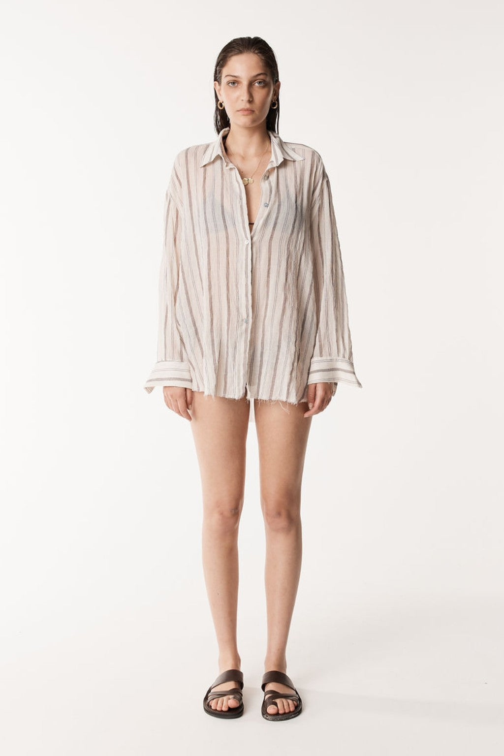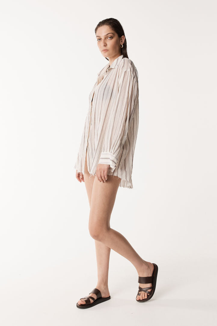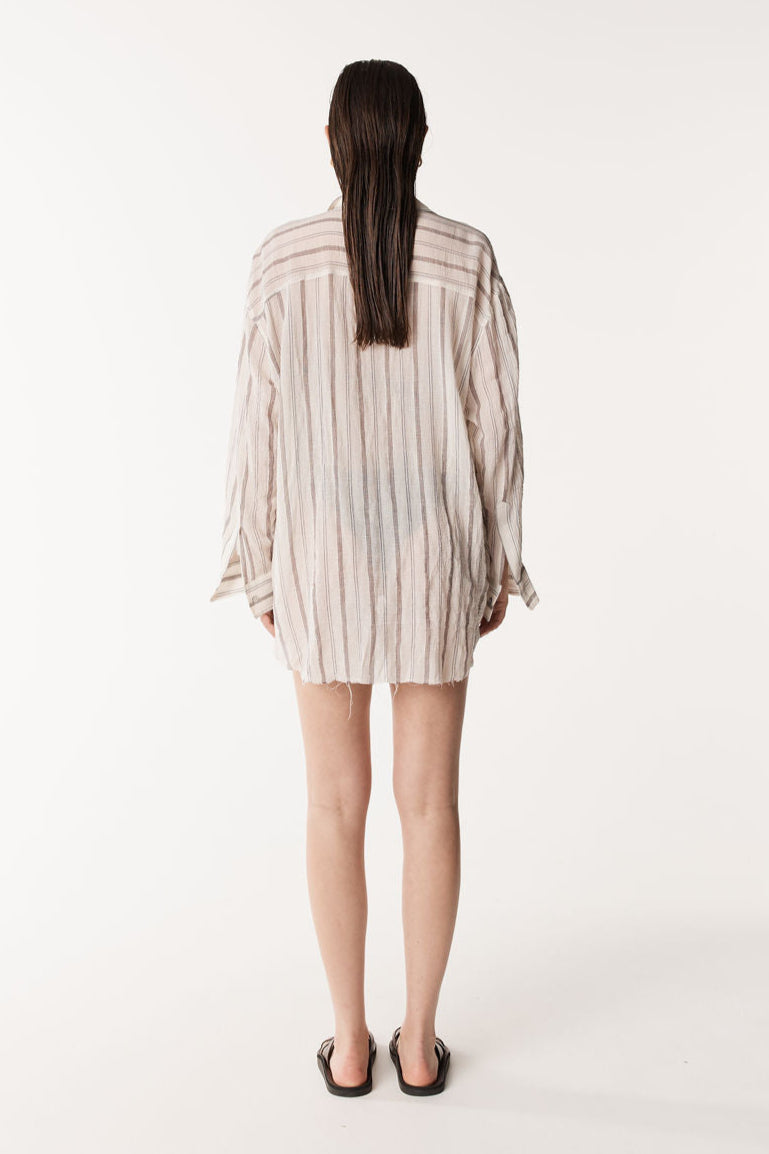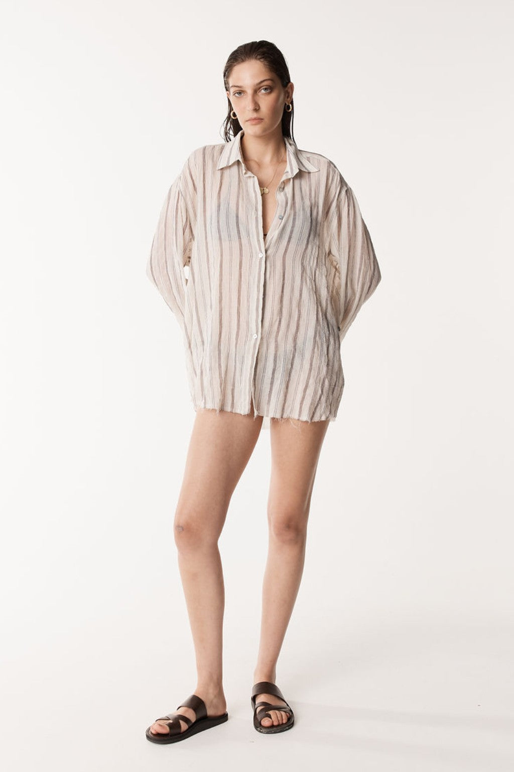 Barely there, cut from the finest crinkled linen, this sheer summer shirt captures effortless ease. Earth-toned stripes sit across a soft vanilla base, bringing subtle warmth to its featherlight drapey form. The silhouette is relaxed yet striking—wide, deep sleeves and a raw edge hem lend it a barely there elegance on those warm days.