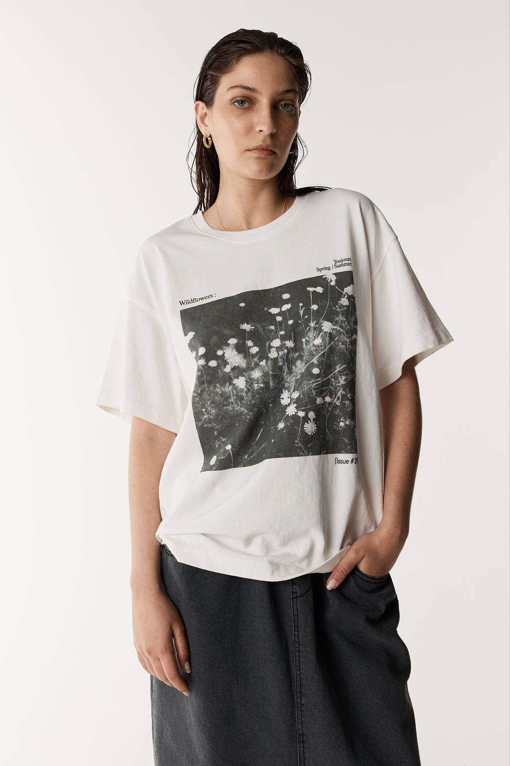 Our Wildflower Tee is made from a mid-weight premium cotton with a relaxed, oversized fit. Deep sleeves and a bold black-and-white photo print of wildflowers add a raw, minimalist edge. Effortlessly cool and easy to wear.